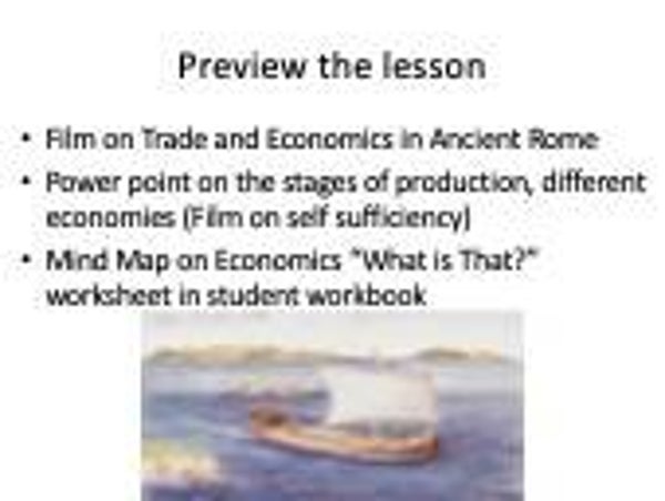 The whole of lesson is displayed it covers the ancient city of Rome and the importance of trade for the economy, The stages of production primary, secondary and tertiary and types of economy.